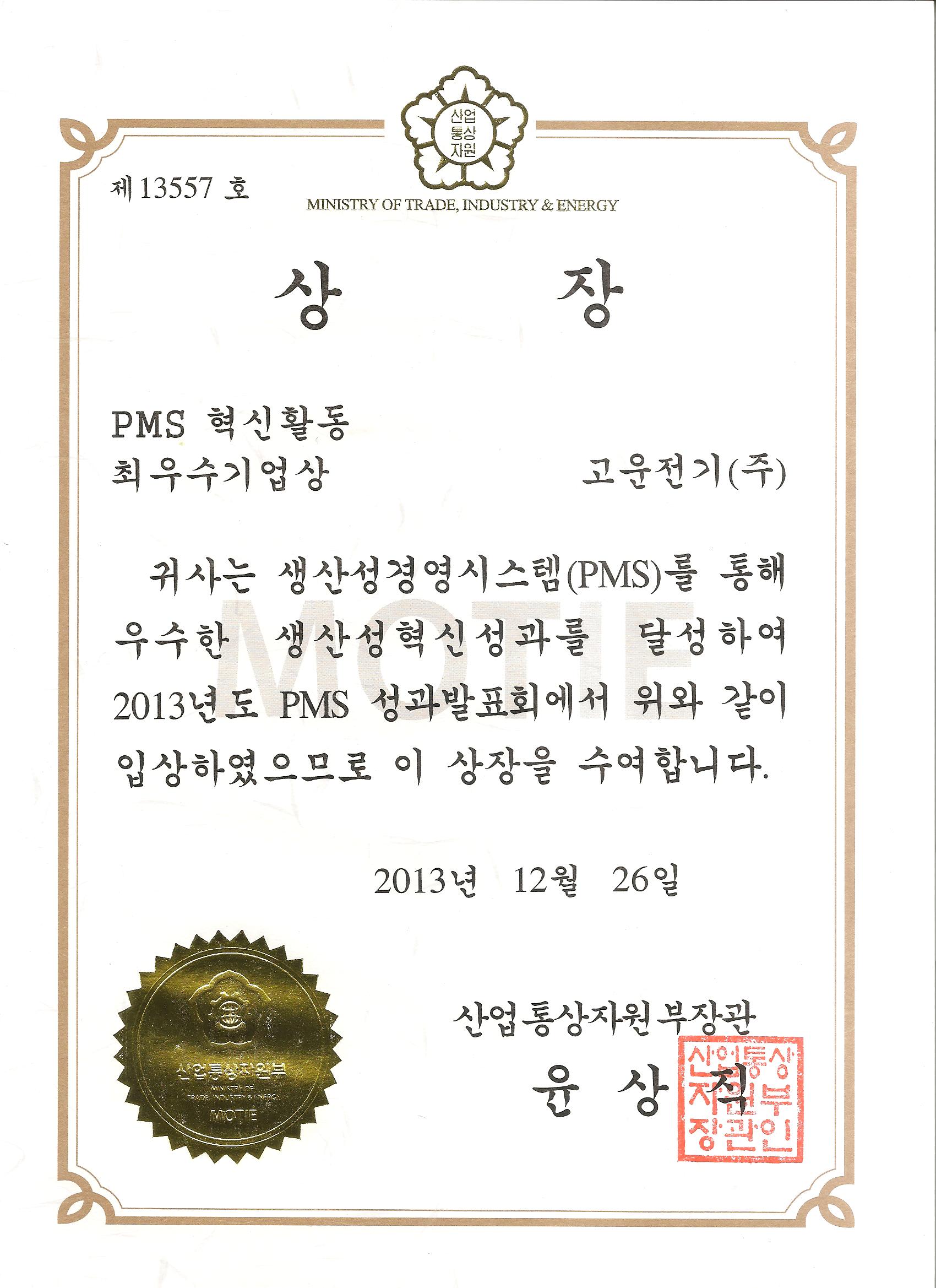2013년도 PMS혁신할동 최우수 기업상 수상