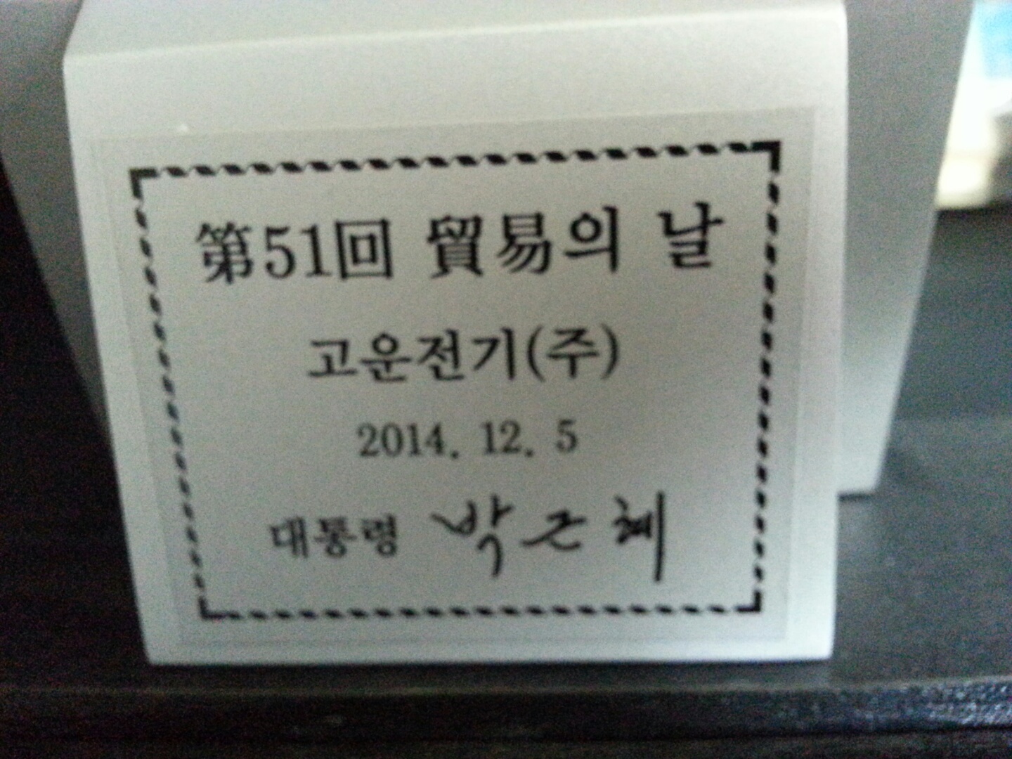 <P>고운전기(주)는 말레이시아 AML프로젝트를 성공적으로 수행하여</P> <P>2014년 12월 5일 무역의날 행사에서 300만불 수출탑을 수상하였습니다.</P> <P> </P>